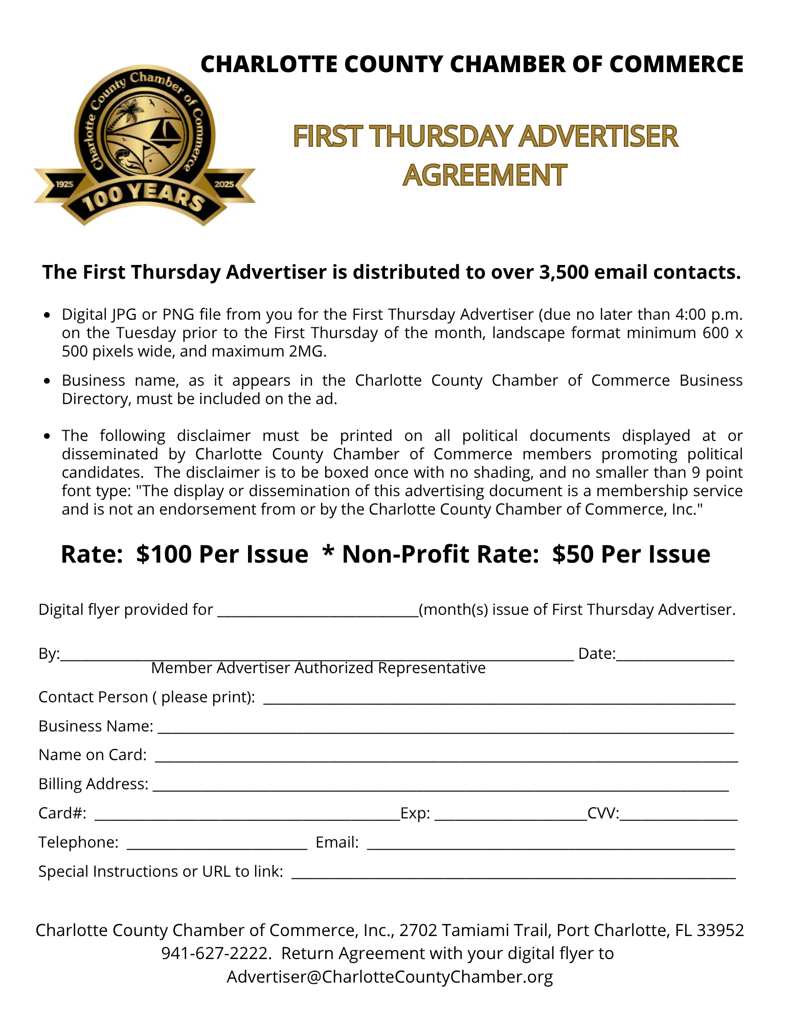 is an exclusive opportunity for members of the Charlotte County Chamber of Commerce. Submit your JPG or PNG file to promote your business, event or special offer. Distributed to over 3,000 email contacts monthly. Cost is $100 per issue * Non-profit rate $50 per issue.
