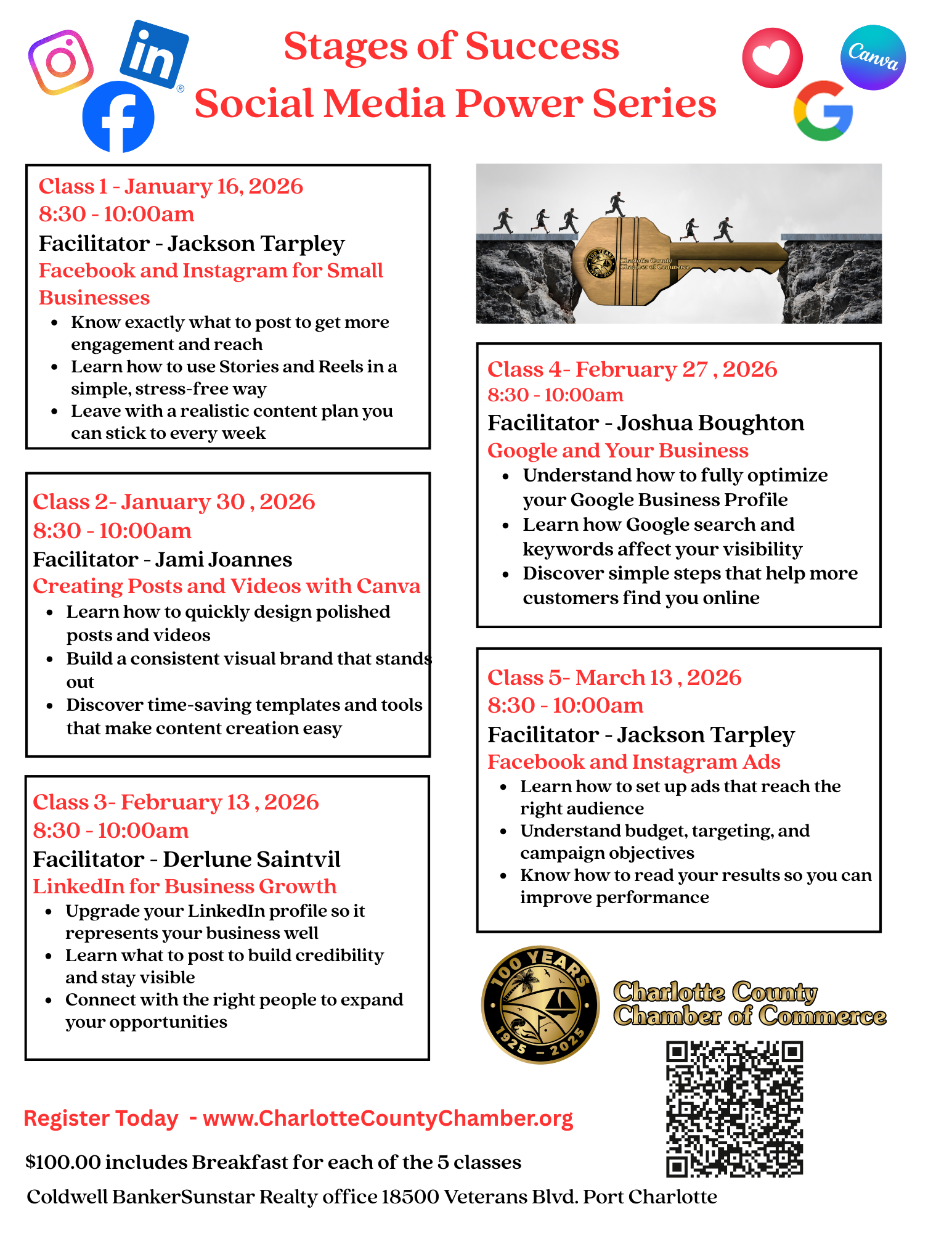 This is a member only benefit. All classes include a hot breakfast before the workshop begins. They will be held at the Coldwell Banker Sunstar Realty, 18500 Veteranns Blvd., Port Charlotte.